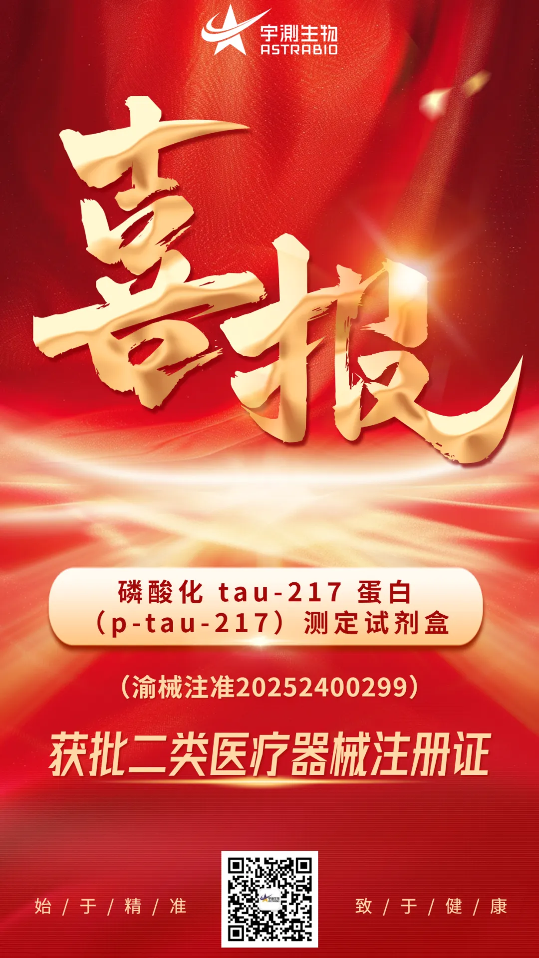 近日,宇測(cè)生物自主研發(fā)的神經(jīng)領(lǐng)域血液檢測(cè)試劑盒:磷酸化tau-217蛋白(p-tau-217)測(cè)定試劑盒,正式通過(guò)重慶市藥品監(jiān)督管理局審批,獲得二類醫(yī)療器械注冊(cè)證。該產(chǎn)品依托公司單分子分析策略的技術(shù)優(yōu)勢(shì),僅需微量血液樣本即可實(shí)現(xiàn)fg/mL級(jí)別的的精準(zhǔn)檢測(cè),為臨床檢測(cè)提供更方便、更精準(zhǔn)的血液早篩工具。